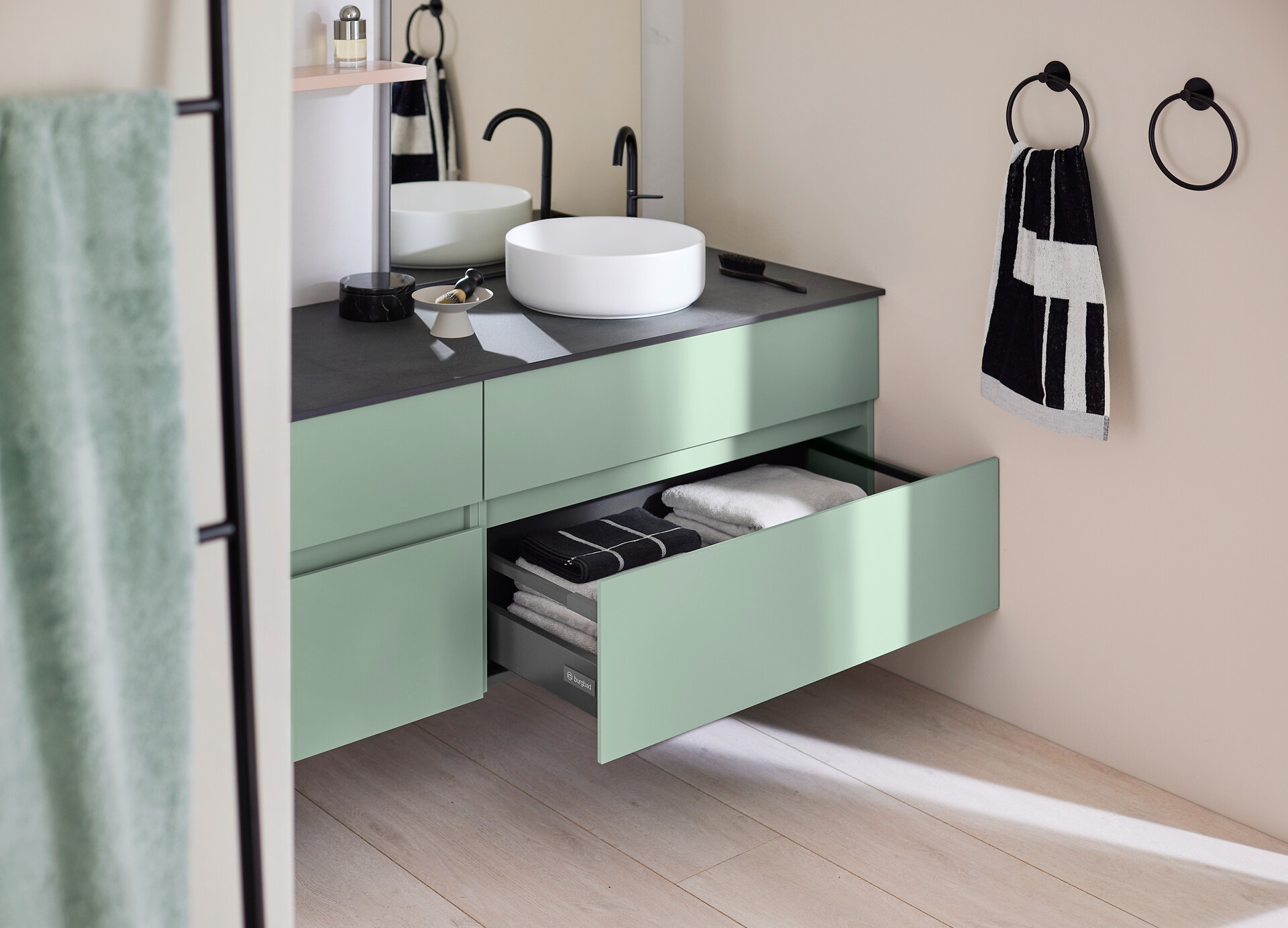 Zu der Vielfalt an Oberflächen und Farben kommen die unendlichen Möglichkeiten an Möbeltypen, Maßen und Kombinationen mit Konsollösungen und Waschtischen in diversen Formen und Materialien. Viele Elemente sind zudem in bis zu drei Dimensionen maßflexibel planbar. Zu den vielen Extras des sys30-Programms neu hinzugekommen ist der neue Hochschrank MagicTwist – ein Verwandlungskünstler, der dank eines innovativen Drehbeschlags den geschlossenen Schrank im Handumdrehen in ein offenes Regal verwandelt und so den Stauraum bis in den hintersten Winkel komfortabel erschließt. Und in Kombination mit dem neuen, besonders hygienischen und reinigungsfreundlichen Raumsparsiphon burgbad cleanFlow werden die mit sys30 planbaren offenen Konsolenlösungen mit (nun auch staubaren!) Aufsatzwaschtischen zur eleganten Universal Design-Lösung.